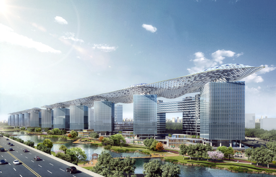 22栋80米高的建筑组成建筑群,却拥有同一个屋盖,这个空中屋盖巨大却又显得轻盈飘逸,行云流水般将园区连接成一个整体的巨构长廊,因而得名“云廊”。